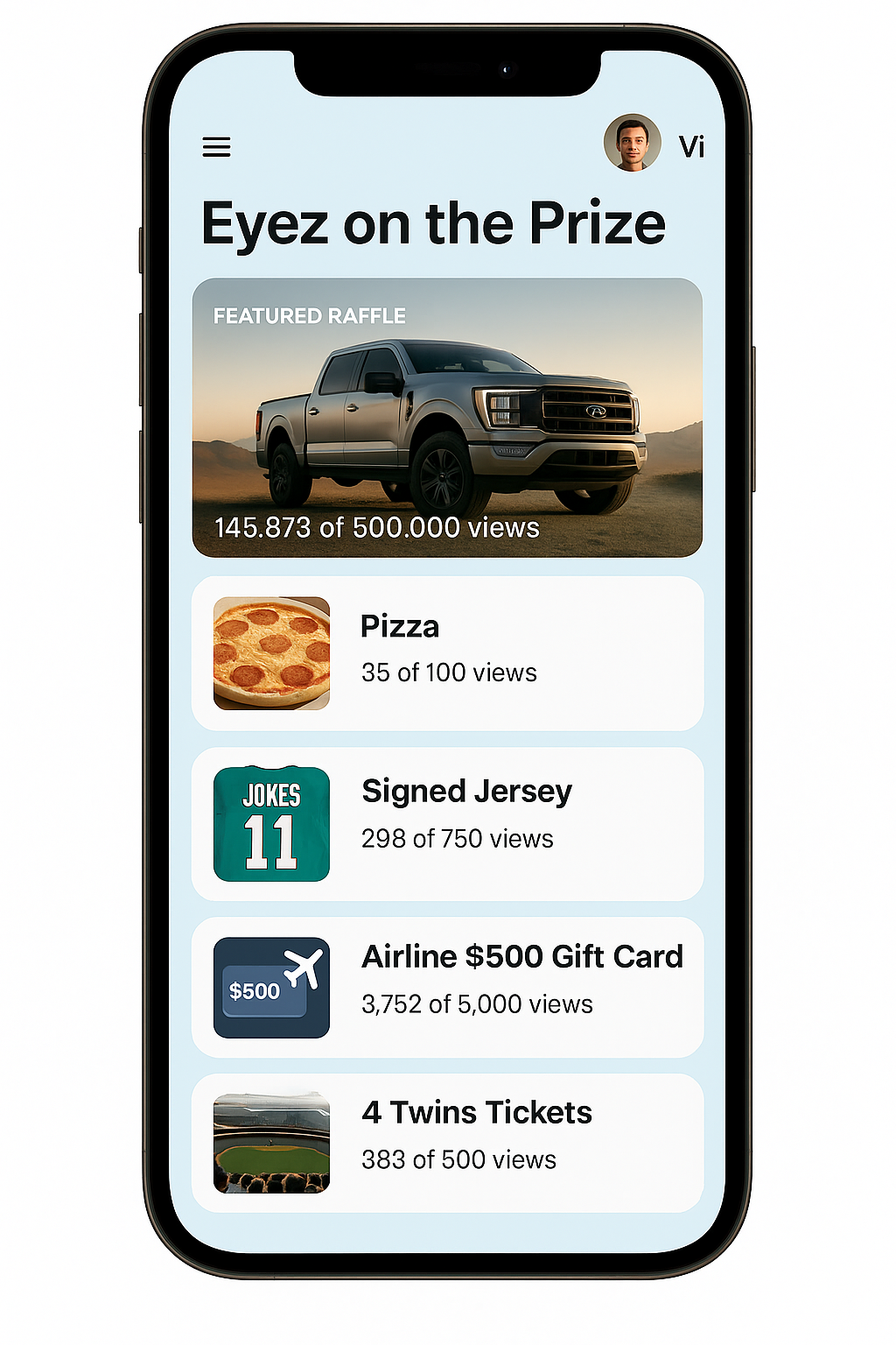 Users watch short branded videos to unlock entry into limited-time prize raffles—no purchase necessary, no catch. Each video must be watched in full to participate. Users receive a raffle number that matches their view order, and a randomizer selects the winner.